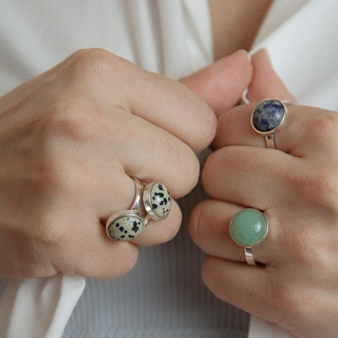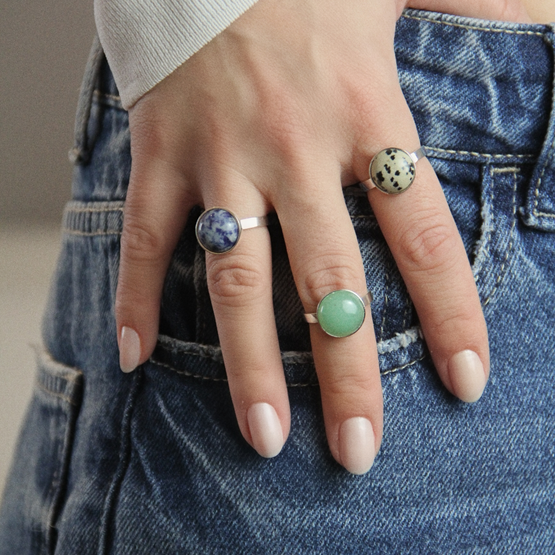 O Anel Dot é delicado e elegante. Com um design minimalista e sofisticado, ele traz uma gema natural no centro, disponível em três opções exclusivas: Jaspe Dálmata, Sodalita ou Quartzo Verde. Perfeito para o uso diário, esse anel combina praticidade e estilo em uma peça leve e confortável. O detalhe especial fica por conta do acabamento interno com estampa de ovinhos, que adiciona charme e exclusividade mesmo nos ângulos mais discretos. Uma joia versátil, moderna e atemporal para quem busca um acessório básico, mas cheio de personalidade.