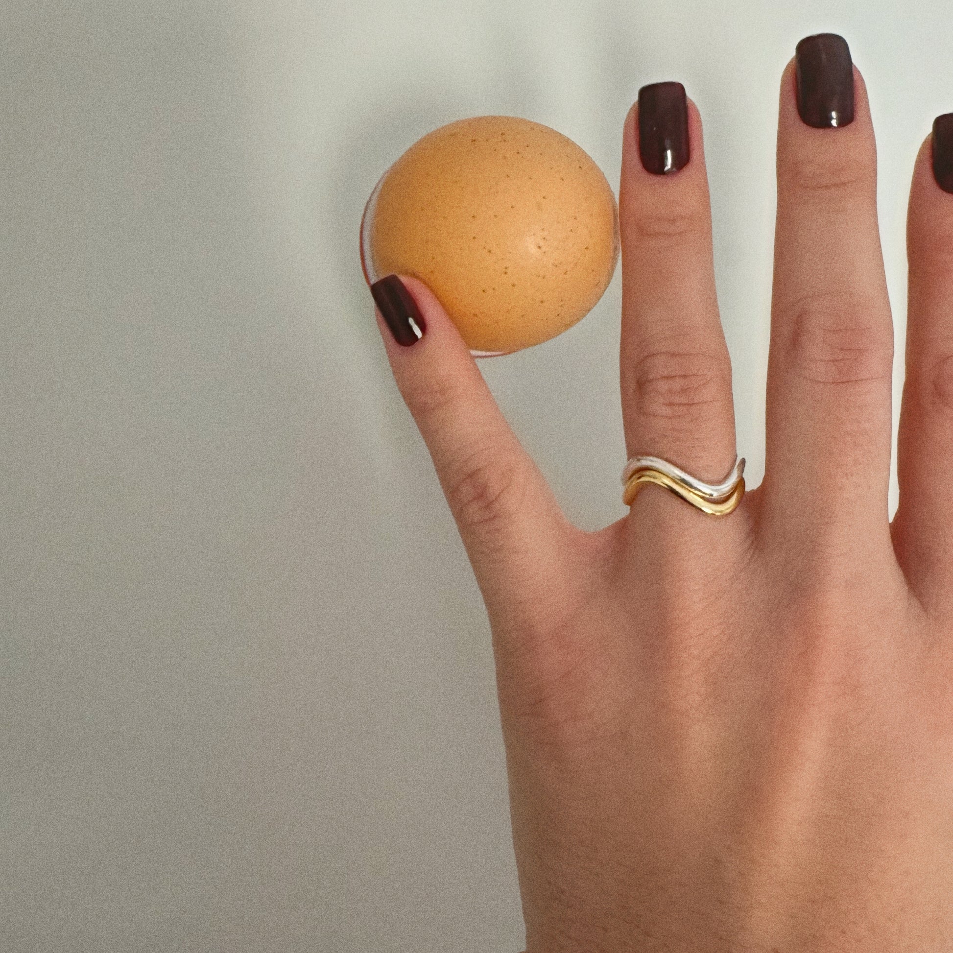 Dois anéis, infinitas combinações. Um em prata, outro em ouro, feitos para se encaixarem perfeitamente quando usados juntos, mas com presença de sobra quando usados separados. Um design versátil e marcante, ideal para quem quer fugir do óbvio e valorizar o mix de metais com estilo.