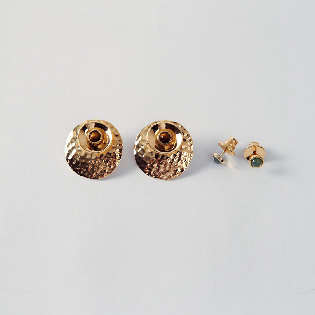 Material: Essa joia é feita com uma liga de cobre e banhada a ouro ou prata, dependendo da escolha. Para cada par de brinco, você receberá duas opções de gemas naturais para trocar e suar de formas diferentes: o quartzo verde e o olho de tigre.
