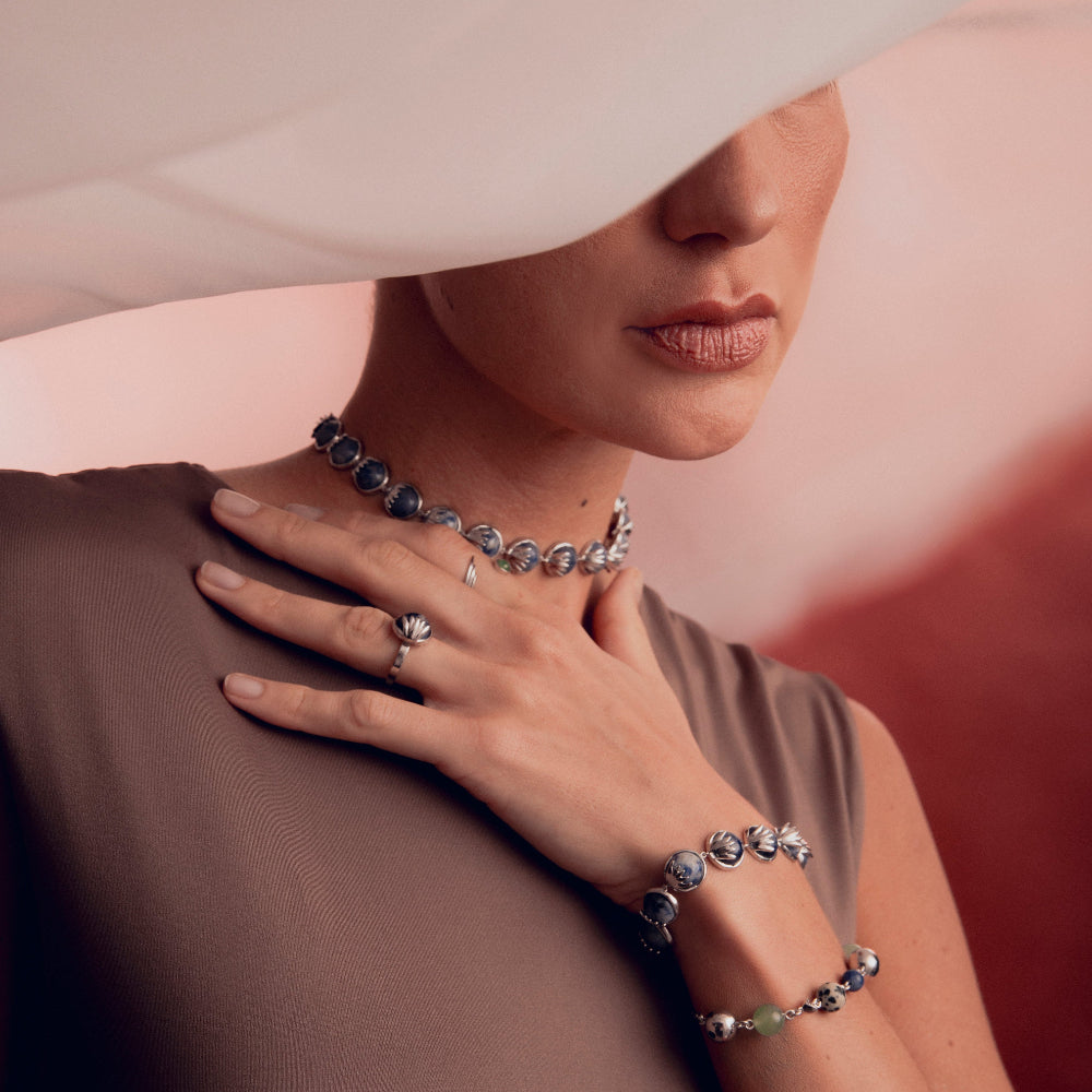 A choker Gaia carrega quinze gemas naturais, dispostas sob asas de metal que criam um desenho envolvente — como se cada pedra estivesse sendo guardada, protegida, preparada para voar. É um colar que não passa despercebido: fala sobre força, instinto e beleza com propósito. Uma peça que impõe presença com elegância e significado.