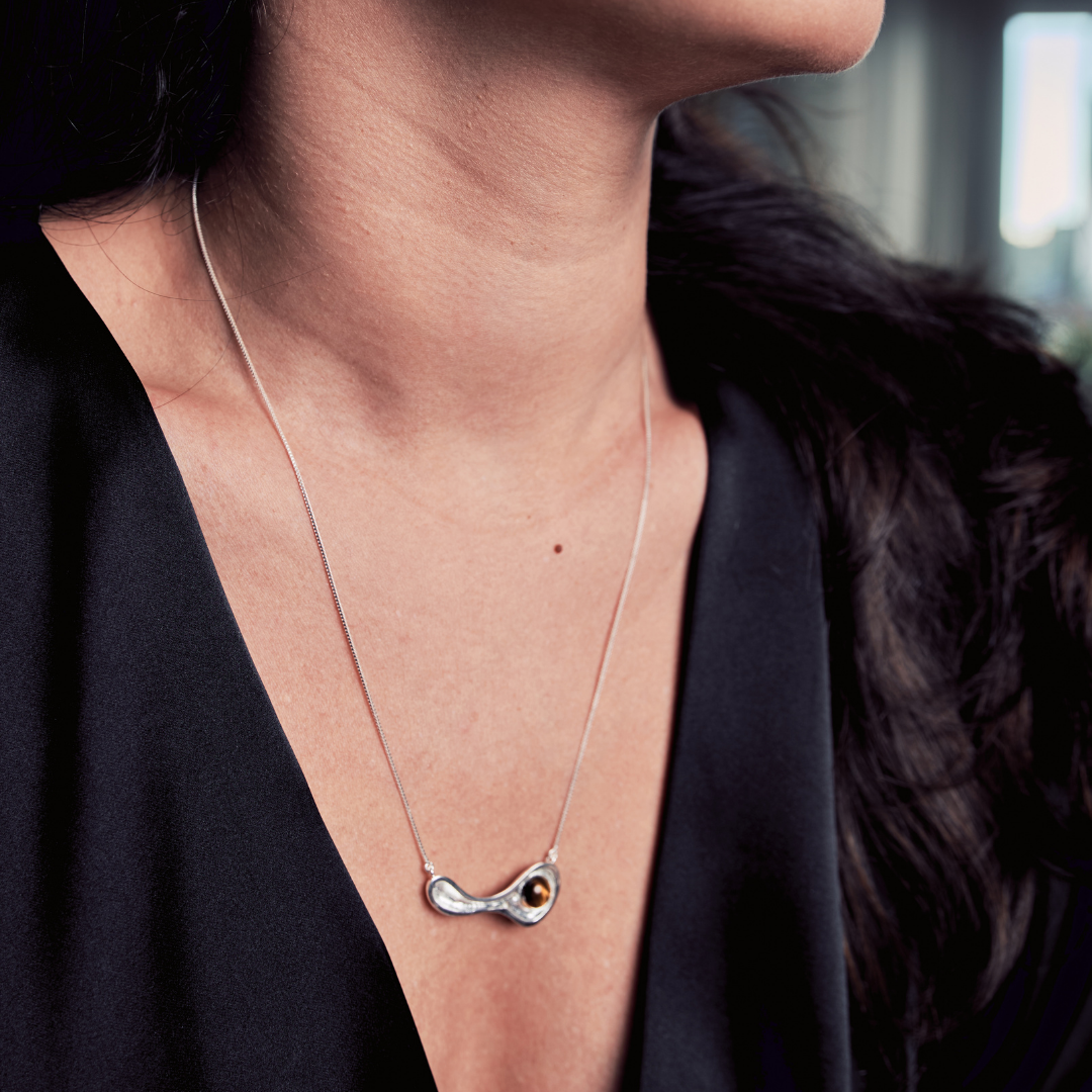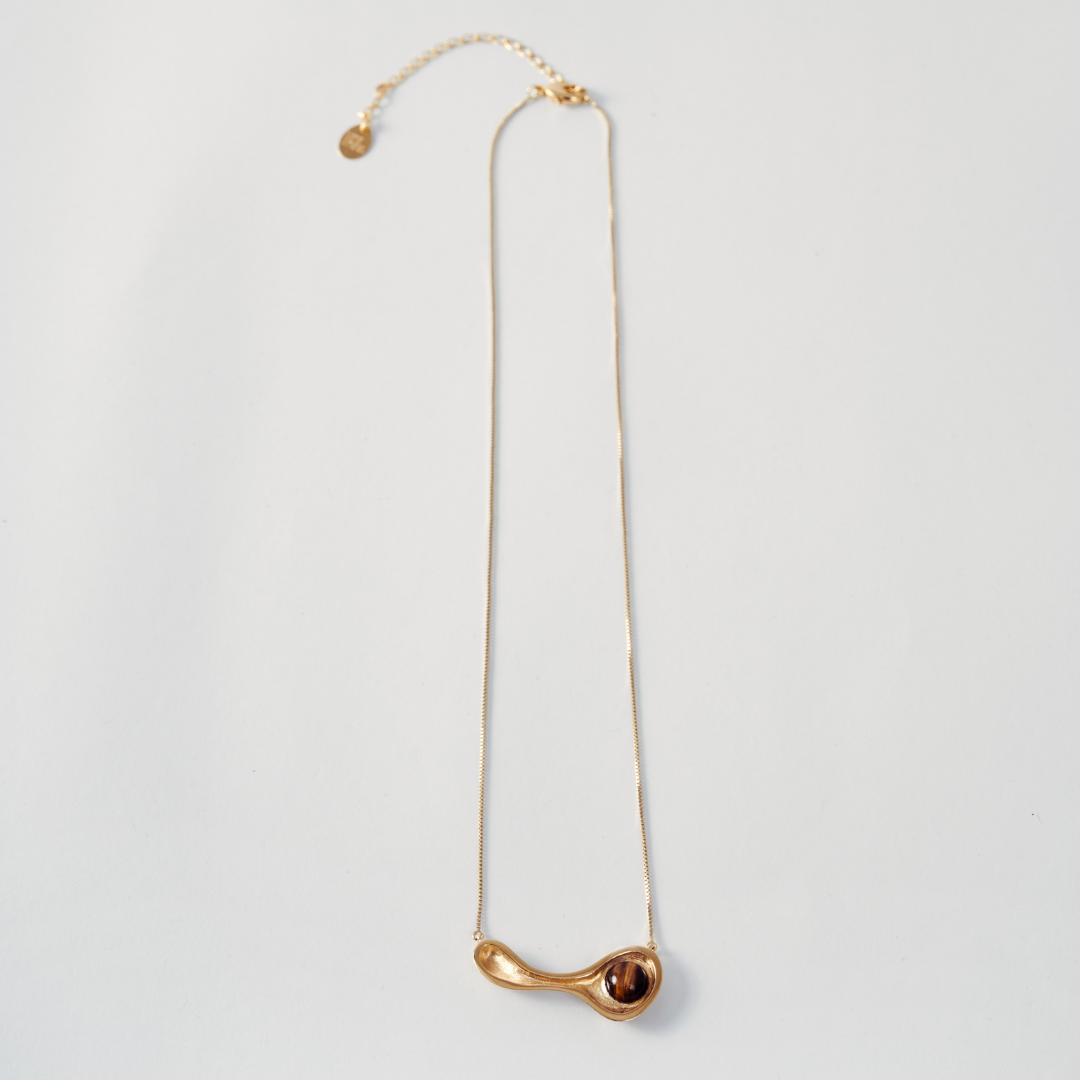 Seu pingente tem forma orgânica e cheia de personalidade, como uma colher moldada pelo tempo, pela mão e pelo uso. A peça é finalizada com uma gema natural, o Olho de Tigre ou o Quartzo Verde, repousando no centro como um ingrediente precioso.