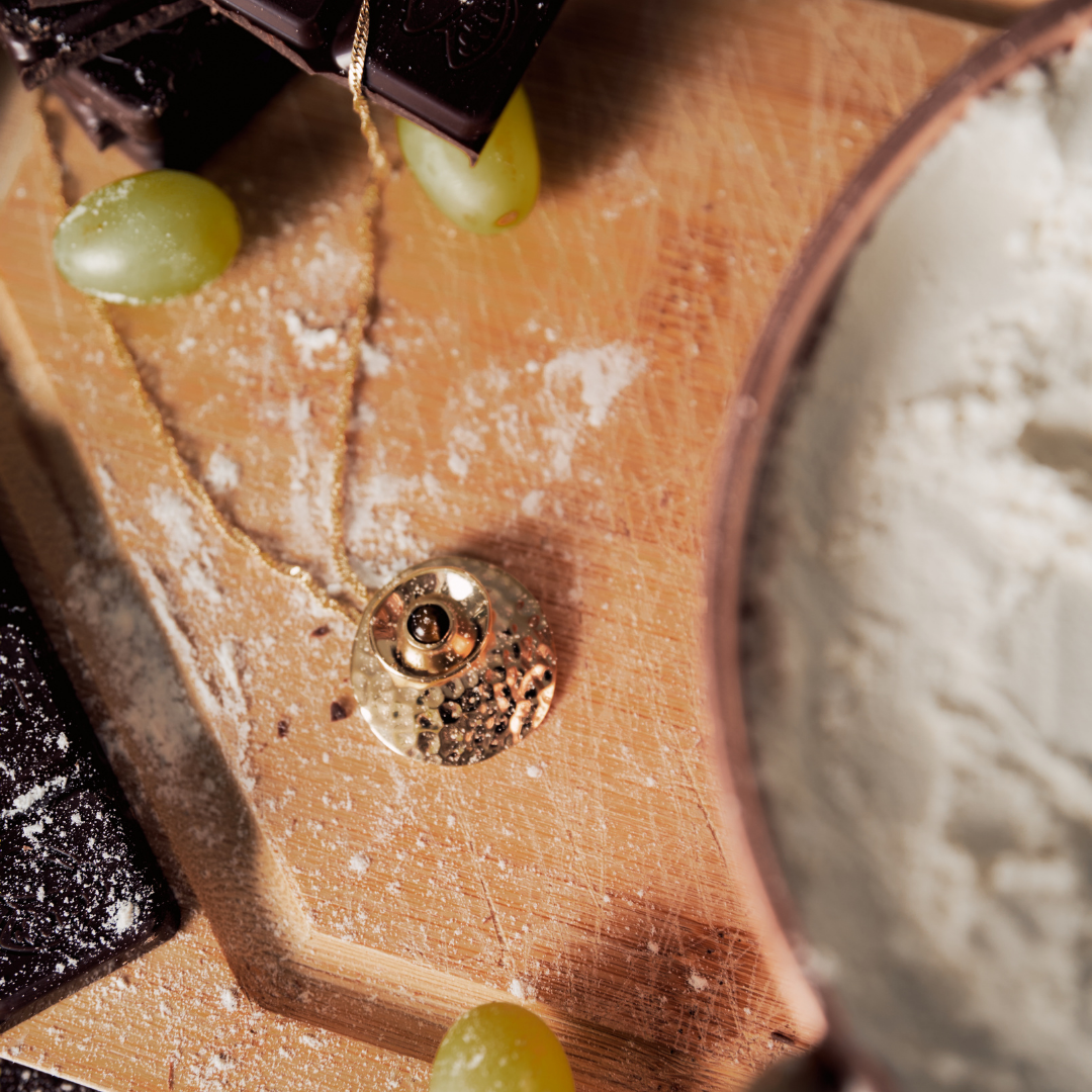 Com corrente com extensor regulável, é uma joia que celebra o tempo, a arte e a beleza do que é feito à mão, tal como os tachos que inspiraram sua história.