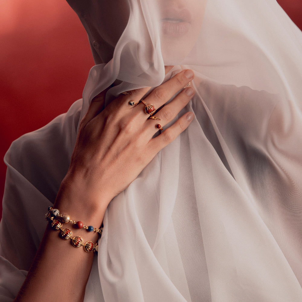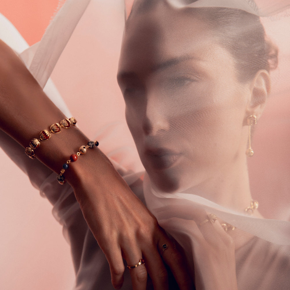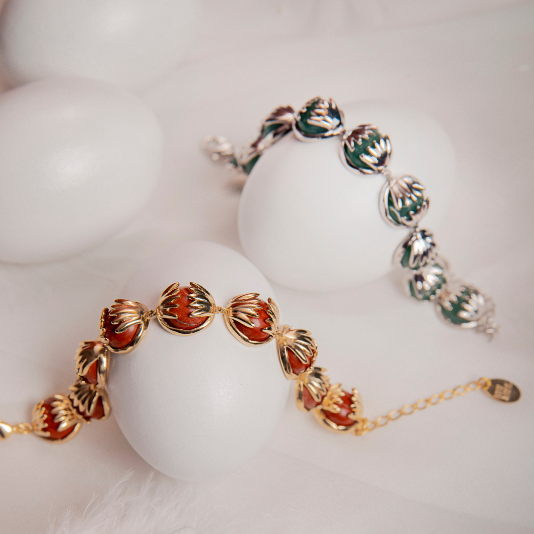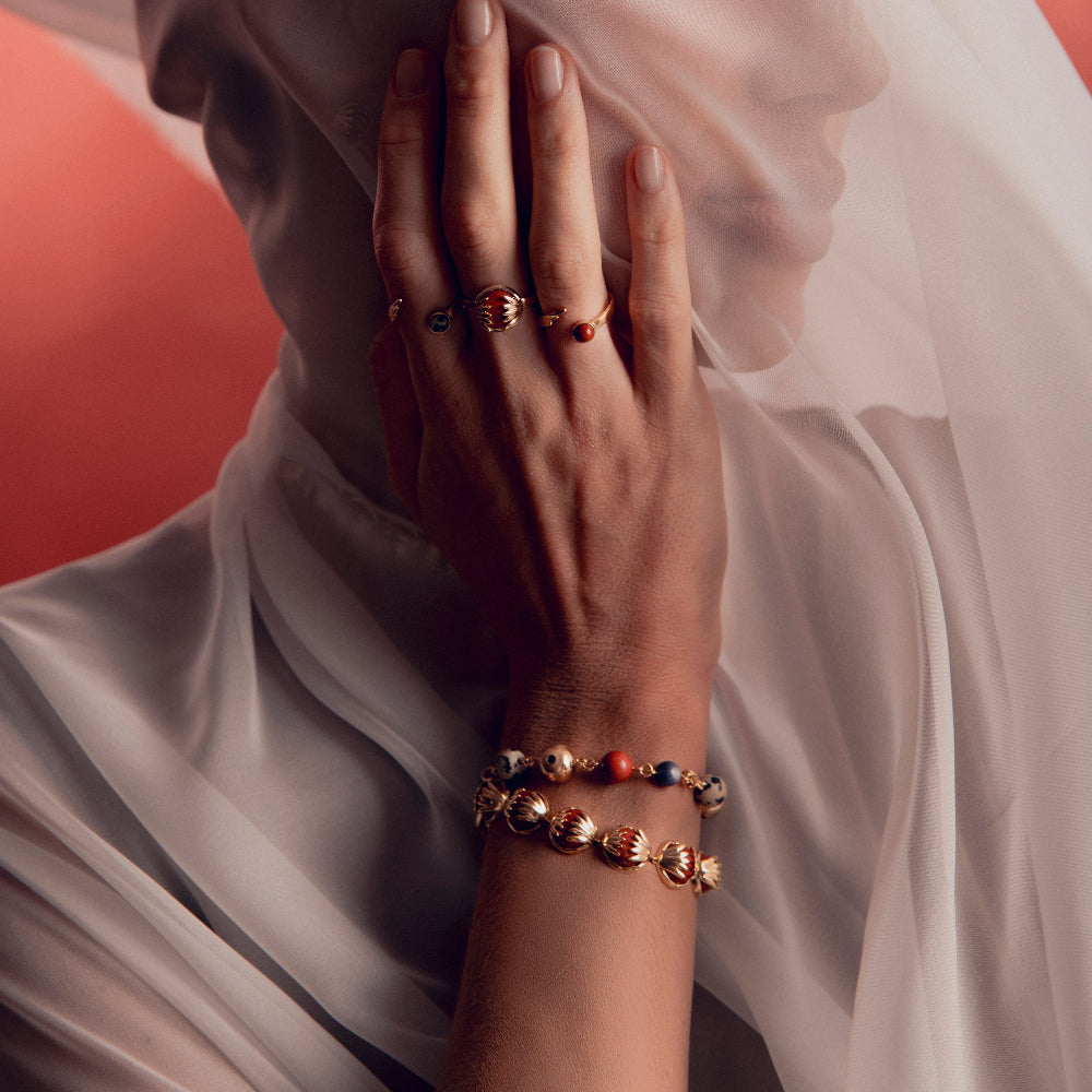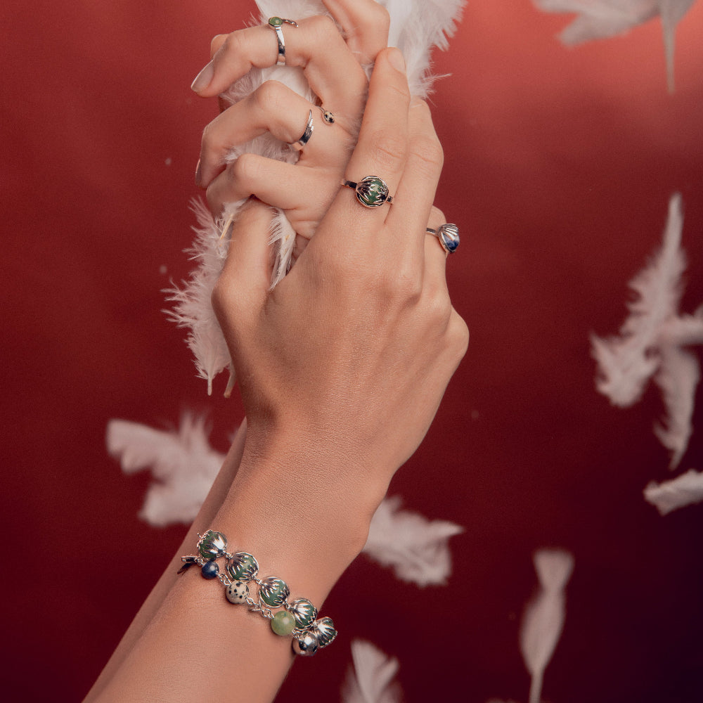 A pulseira Celina carrega nove gemas naturais, dispostas sob asas de metal que criam um desenho envolvente — como se cada pedra estivesse sendo guardada, protegida, preparada para voar. É uma pulseira que não passa despercebida: fala sobre força, instinto e beleza com propósito. Uma peça que impõe presença com elegância e significado
